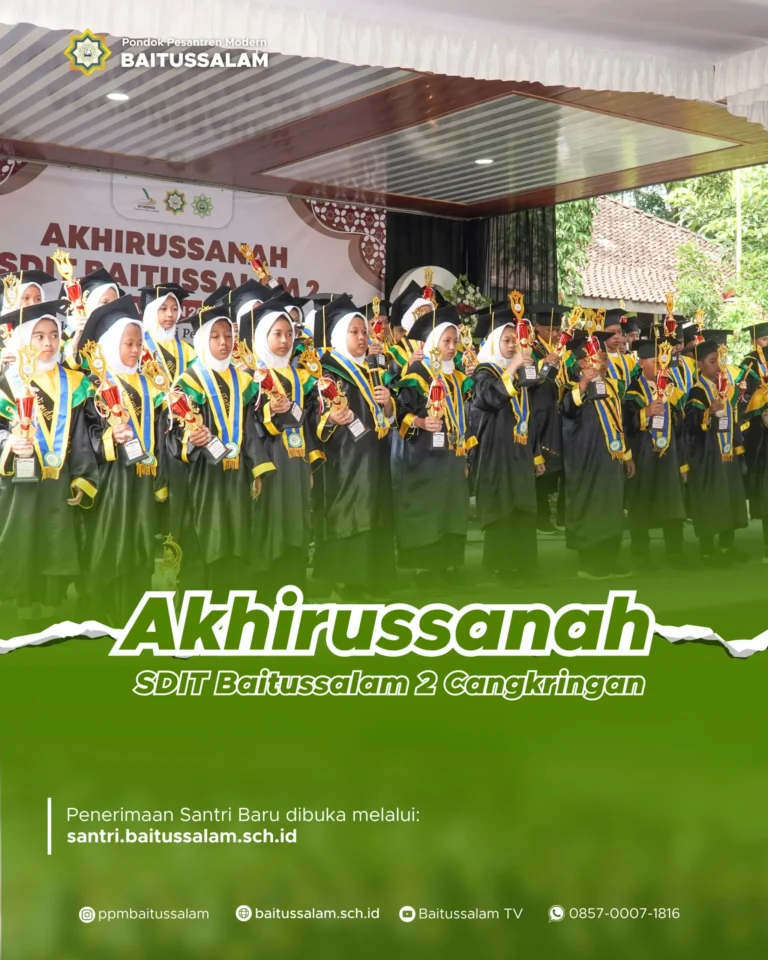 Sleman-SDIT Baitussalam 2 Cangkringan menggelar acara Akhirussanah siswa kelas 6 Tahun Ajaran 2024/2025 dengan tema “Mengukir Sejarah Menjadi Pemenang Masa Depan” pada Selasa 24 Juni 2025 di kompleks SDIT Baitussalam 2 Cangkringan. Akhirussanah ini diikuti oleh 54 siswa kelas 6, serta dihadiri oleh jajaran guru, orangtua siswa dan tamu undangan. Dalam acara ini hadir pula anggota DPRD Kabupaten Sleman Bapak Yani Fathur Rahman, S.Pd.I, dan perwakilan Panewu Kapanewon Cangkringan.