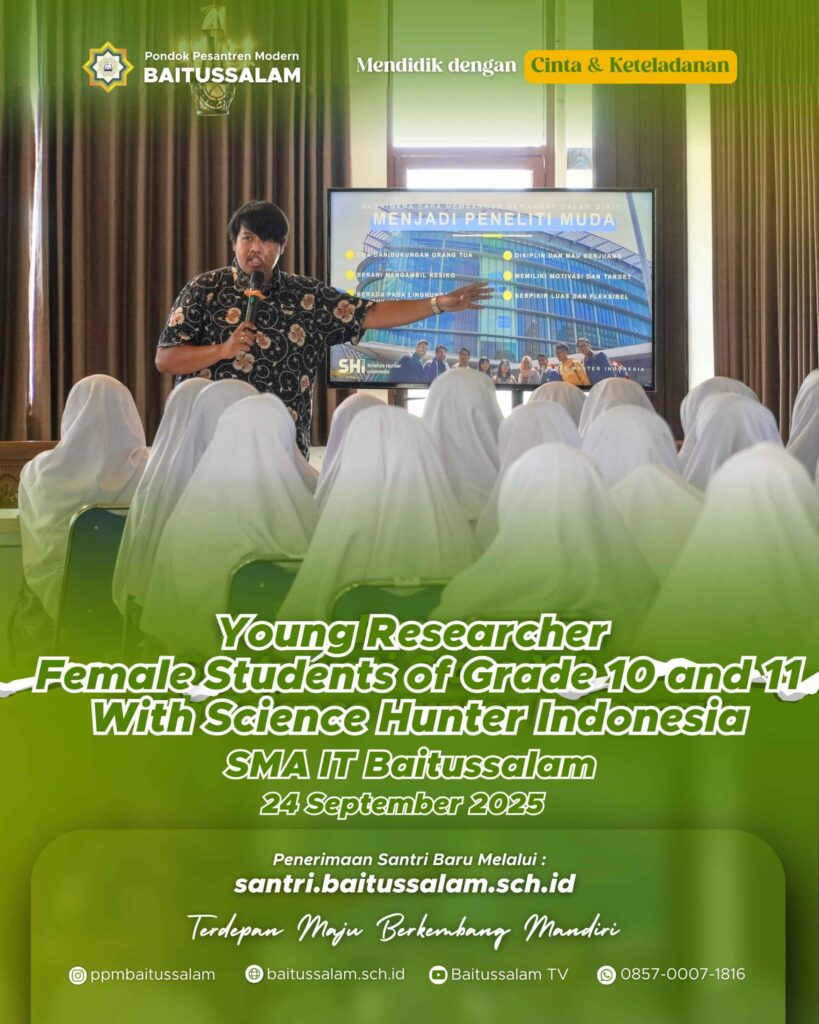 Sleman – Dalam rangka menumbuhkan jiwa peneliti dalam diri santri, SMA IT Baitussalam selenggarakan Young Researcher Female Students . Kegiatan ini dilaksanakan selama dua hari, yaitu hari Rabu – Kamis, 24 – 25 September 2025 di Gedung Pusat PPM Baitussalam. Berkolaborasi dengan Science Hunter Indonesia (SHI) , kegiatan ini khusus diikuti oleh santriwati kelas X dan […]