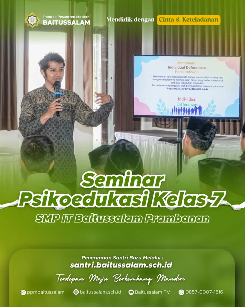 Sleman-SMP IT Baitussalam Prambanan menggelar agenda seminar psikoedukasi pada Sabtu, 9 Agustus 2025 di aula gedung pusat Pondok Pesantren Modern Baitussalam Prambanan. Acara ini diikuti oleh seluruh santri kelas 7 dan bekerja sama dengan Biro Konsultasi Psikologi Paripurna Yogyakarta. Tujuan dari acara ini adalah untuk membekali santri agar lebih mengenal tentang dirinya dan bisa memaksimalkan […]