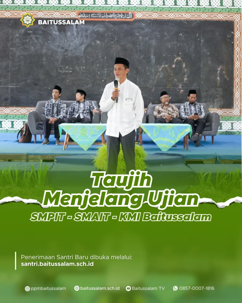 Sleman-Pimpinan Pondok Pesantren Modern Baitussalam berikan taujih menjelang ujian untuk para santri. Taujih ini diinisiasi oleh Bidang Kepengasuhan Pondok Pesantren Modern Baitussalam. Tujuan dari acara ini adalah membekali para santri untuk mempersiapkan diri sebaik-baiknya dalam mengahadapi ujian akhir tahun pelajaran 2024/2025. Taujih menjelang ujian dilaksanakan pada hari Senin, 9 Juli 2025 dari pukul 07.00 WIB […]