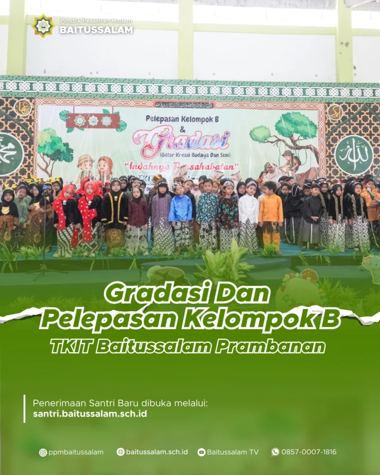 Sleman, TKIT Baitussalam Prambanan menggelar acara Gradasi KB, TK A, dan Akhirussanah siswa kelas B Tahun Ajaran 2024/2025 pada Sabtu dan Ahad (14–15 Juni) di GOR Pondok Pesantren Modern Baitussalam Prambanan. Kegiatan ini diikuti oleh 113 siswa dan dihadiri oleh jajaran guru, orang tua siswa, serta tamu undangan.