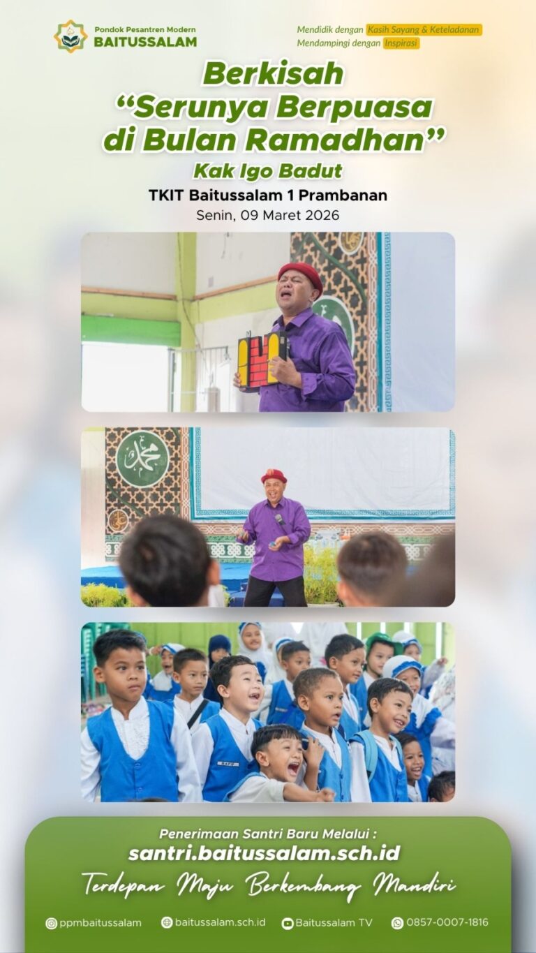 Sleman – Hari Senin, tanggal 9 Maret 2026 sekitar pukul 08.00 WIB, KBIT dan TKIT Baitussalam Prambanan mengelar kegiatan Berkisah dengan topik “ Serunya Berpuasa di Bulan Ramadhan”.Kegiatan dilaksanakan di GOR PonPes  Modern Baitussalam. Kegiatan ini diikuti oleh peserta didik dari KBIT Baitussalam 6 kelas dan TKIT Baitussalam, Kelas TK A sebanyak 6 kelas dan Kelas TK B sebanyak 6 kelas.  Hari itu bertepatan juga dengan hari terakhir anak – anak masuk sekolah di bulan Ramadhan.