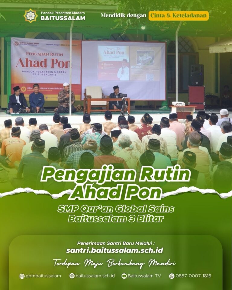 Blitar–Pondok Pesantren Modern Baitussalam 3 Blitar kembali menggelar pengajian lapanan Ahad Pon, 2/11/2025 di depan masjid komplek pondok pesantren. Pengajian ini dihadiri oleh lebih dari 300 peserta yang terdiri dari orangtua santri, ustadz /ustadzah, tokoh masyarakat dan masyarakat sekitar baik orangtua, muda mudi maupun anak anak. Tujuan dari kegiatan ini adalah untuk menjalin komunikasi, silaturahmi, dan berbagi ilmu dengan masyarakat.