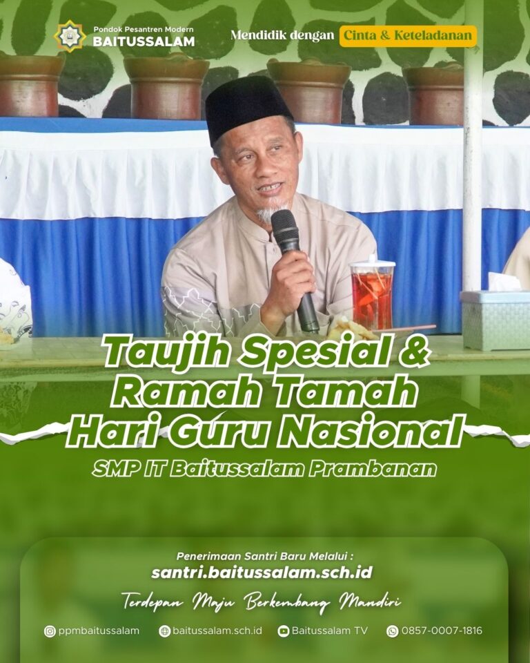 Sleman SMP IT Baitussalam Prambanan menggelar kegiatan Ramah Tamah Hari Guru Nasional bertema “Menguatkan Peran Murobi dalam Tarbiyah” pada Selasa, 25 November 2025, pukul 10.00–12.00 WIB di Warung Kali Lereng, Klurak. Acara diikuti seluruh civitas akademik sebagai upaya mempererat ukhuwah dan meneguhkan kembali peran guru dalam mendidik peserta didik.
