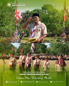 Sleman — Pondok Pesantren Modern (PPM) Baitussalam menyelenggarakan upacara peringatan Hari Pramuka ke-64 di Lapangan Baitussalam, Jumat (15/8/2025). Kegiatan ini mengusung tema “Kolaborasi untuk Membangun Ketahanan Bangsa” yang dimaknai bukan sekadar slogan. Melainkan tekad bersama untuk memperkuat jati diri Pramuka sebagai insan Pancasila yang siap menjaga keutuhan Negara Kesatuan Republik Indonesia. Upacara diikuti oleh peserta dari SD IT Baitussalam Prambanan, SMP IT Baitussalam Prambanan, SMA IT Baitussalam, hingga KMI Baitussalam. Seluruh unit PPM Baitussalam terlibat sebagai petugas upacara. Ustadz Jawaldi Abdullah, S.E., bertindak sebagai pembina upacara.