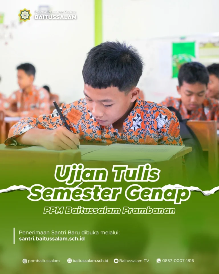 Sleman-Santri Pondok Pesantren Modern Baitussalam Prambanan menjalani ujian tulis akhir tahun ajaran 2024/2025. Untuk unit boarding rangkaian ujian tulis telah diawali dengan ujian lisan. Salah satu tujuan dari ujian tulis ini adalah untuk mengukur penguasaan kompetensi mata pelajaran yang telah diajarkan oleh ustadz dan ustadzah kepada santri selama masa pembelajaran di semester genap ini.