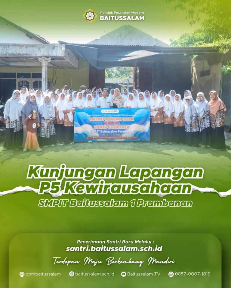 Prambanan – Dalam rangka pelaksanaan Proyek Penguatan Profil Pelajar Pancasila (P5) dengan tema Kewirausahaan, SMP IT Baitussalam Prambanan mengadakan kegiatan kunjungan lapangan ke rumah industri Bakpia Crispy AA. Kegiatan ini berlangsung selama dua hari, yaitu pada Senin, 30 Juni 2025 untuk santri ikhwan, dan Rabu, 2 Juli 2025 untuk santri akhwat kelas 8.