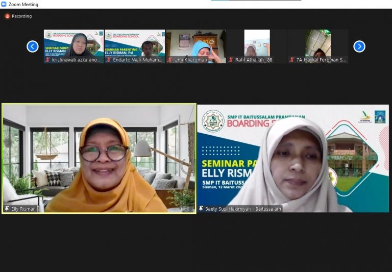 Acara selanjutnya acara inti yang akan disampaikan Bu Elly Risman yang dimoderatori oleh Ustadzah Baety Susi Hakimiyah, S.Pd.   Sebelumnya beliau menyampaikan aturan tata tertib untuk menyiapkan alat tulis dan kertas yang disampaikan. Selanjutnya Bu Elly Risman menyampaikan aturan untuk kesepakatan bentuknya ruang konseling. Beliau menyampaikan tentang pandemi ini, bahwa membuat orang tua menjadi guru untuk anak yang online, belajarnya dari rumah.  Ini yang membuat orang tua mengalami stress dan berpengaruh kepada psikis.  Pihak pondok harus ada seleksi sebelum anak masuk pondok. Selanjutnya  pertanyaan-pertanyaan diberikan kepada Bu baety dan orang tua. Untuk moderator bisa menjawab langsung dan orang tua ikut menjawab di kolom chat.