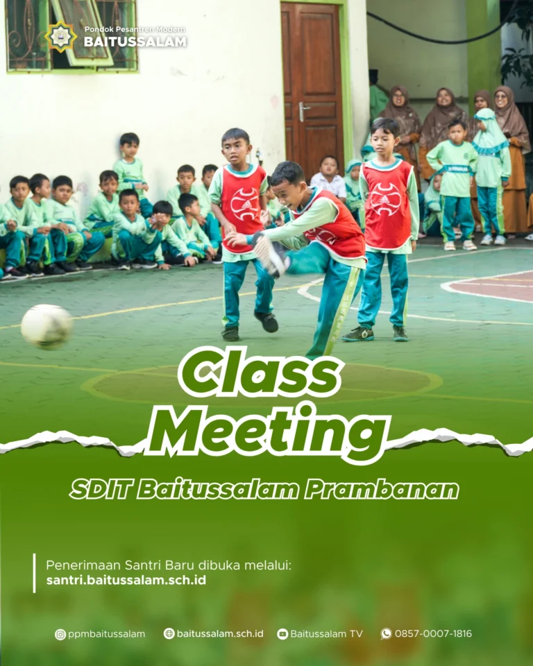 Kegiatan classmeeting ini merupakan program sekolah yang dilaksanakan dua kali per semester yaitu setelah murid menyelesaiakan penilaian yang diselenggarkan sekolah. Classmeeting ini diikuti oleh siswa kelas 1 sampai dengan siswa kelas 5 SD IT Baitussalam. Kegiatan ini bertempat di kompleks Gedung SD IT Baitussalam Prambanan, GOR, Ruang TIK dan di lapangan Baitussalam. Rencananya kegiatan seru ini akan berlangsung selama lima hari dari Senin, 16 Juni sampai dengan Jum’at, 20Juni 2025.